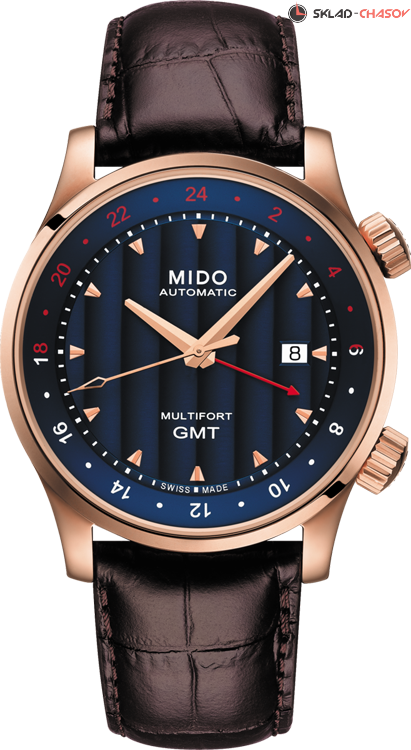 Мужские часы с индикацией времени второго часового пояса, с помощью центральной стрелки и разметки на циферблате. Апертура даты в положении 3 часа.