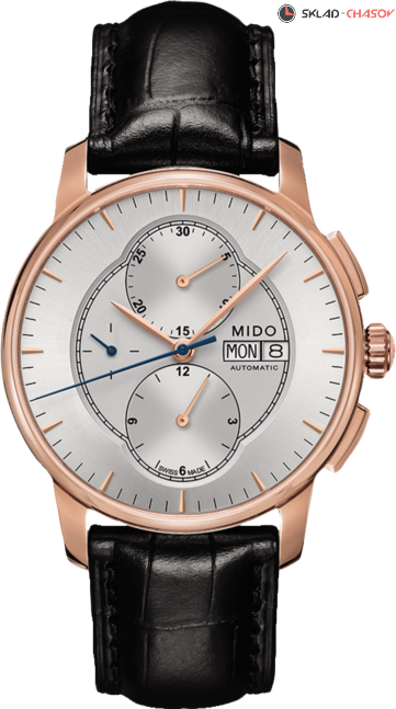 Классический автоматический хронограф. Циферблат украшен узором Sunray и полированными накладными метками. 12-часовой счетчик расположен на 6 часов, 30-минутный на 12 часов и малая секунда на 9 часов. По центру циферблата аккуратно расположилась индикация дня недели и даты.
