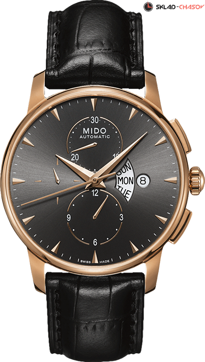 Классический автоматический хронограф. Циферблат украшен узором Sunray и полированными накладными метками. 12-часовой счетчик расположен на 6 часов, 30-минутный на 12 часов и малая секунда на 9 часов. По центру циферблата аккуратно расположилась индикация дня недели и даты.