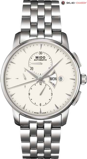 Классический автоматический хронограф. Циферблат украшен узором Sunray и полированными накладными метками. 12-часовой счетчик расположен на 6 часов, 30-минутный на 12 часов и малая секунда на 9 часов. По центру циферблата аккуратно расположилась индикация дня недели и даты.