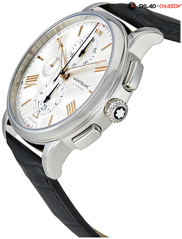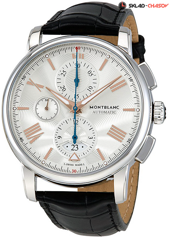 Классический мужской хронограф с индикацией даты. Изысканный гильошированный циферблат, украшенный расходящимся волнами и логотипом Montblanc. Модель дополняет кожаный ремешок.
