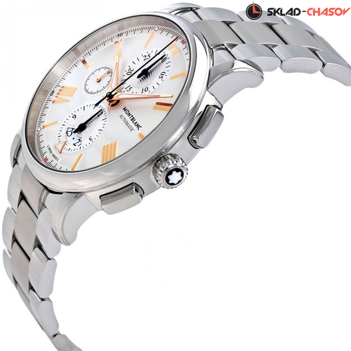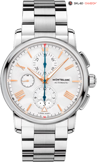Классический мужской хронограф с индикацией даты. Изысканный гильошированный циферблат, украшенный расходящимся волнами и логотипом Montblanc. Модель дополняет стальной браслет.