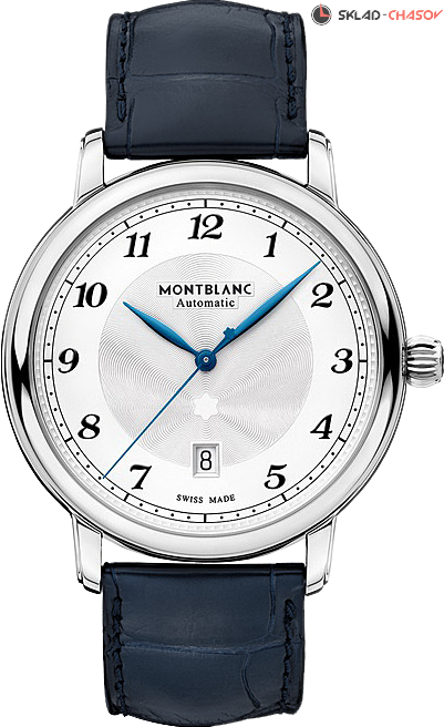 Элегантная мужская механическая модель с автоподзаводом. Изысканный гильошированный серебристо-белый циферблат, украшенный расходящимся волнами и логотипом Montblanc. Модель дополняет кожаный ремешок.