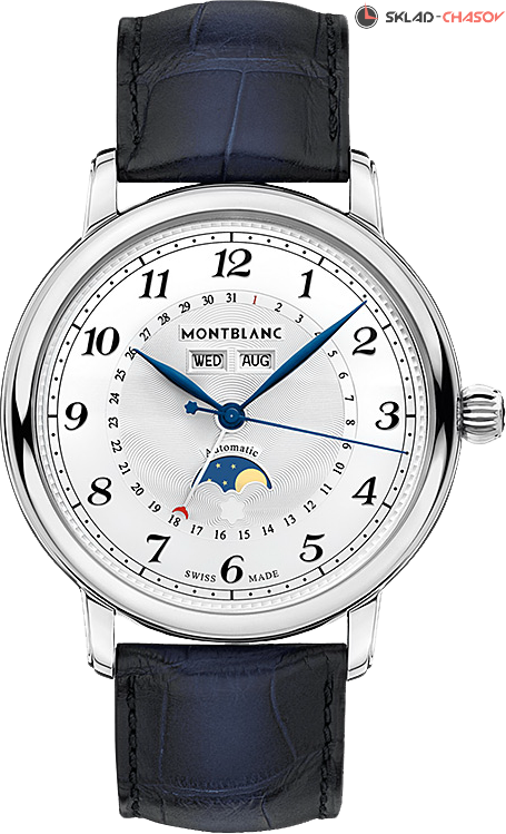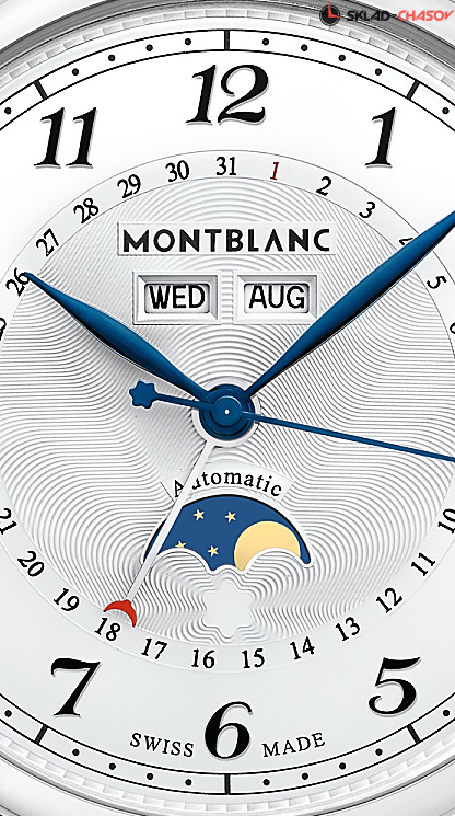 Элегантная мужская механическая модель с автоподзаводом и полным календарем включающим в себя отображение: часов, минут, даты, дня недели, месяца и лунной фазы.Изысканный гильошированный серебристо-белый циферблат, украшенный расходящимся волнами и логотипом Montblanc. Модель дополняет кожаный ремешок.