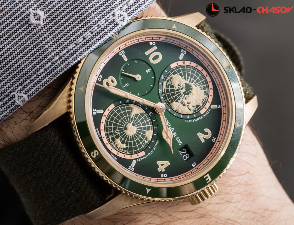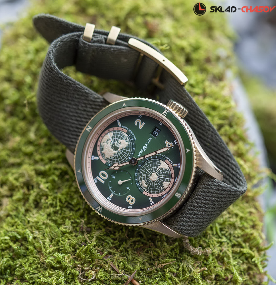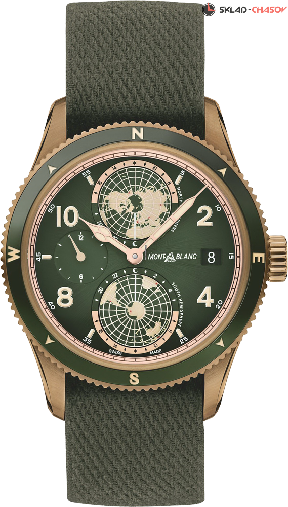 Элегантная мужская механическая модель в бронзовом корпусе и с сложной функцией индикации мирового времени и уникальной гравировкой на задней крышке. Модель Montblanc 1858 Geosphere посвящена альпинистам, желающим покорить семь вершин мира. Часы дополнены тканевым ремешком.