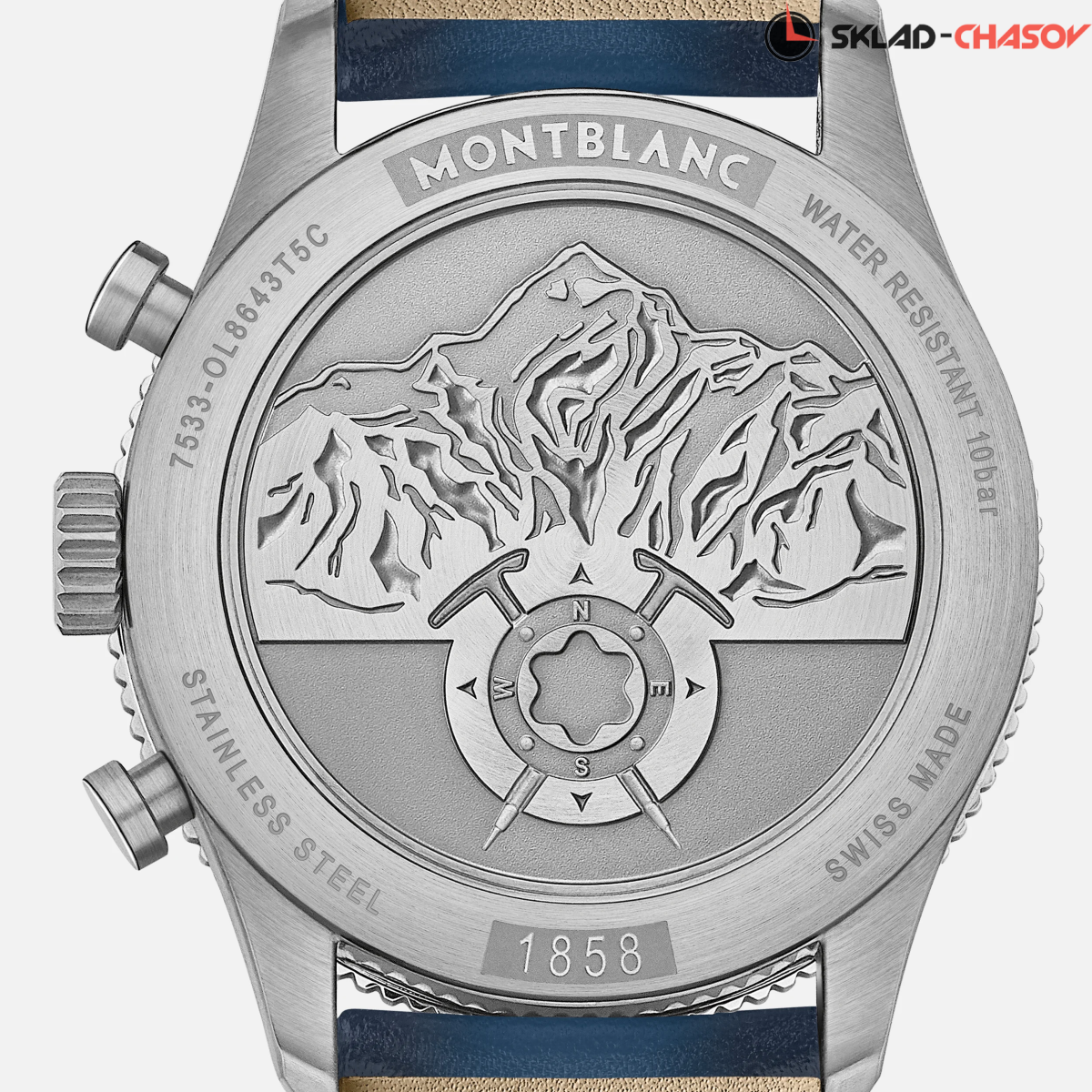 Элегантная мужская механическая модель с автоподзаводом. Задняя крышка украшена выгравированным горным массивом Монблан. Модель вдохновлена ледниками, отсюда и синяя эстетика. В часах установлен двухсторонний стальной безель, усиленный блестящей синей керамикой и четырьмя гравированными люминесцентными кардинальными точками.