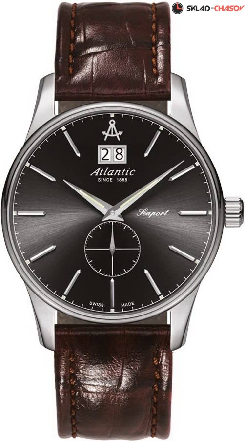 Часы, минуты, маленькая секундная стрелка. Индикация числа. Кожаный ремешок. Диаметр корпуса 39 мм.
