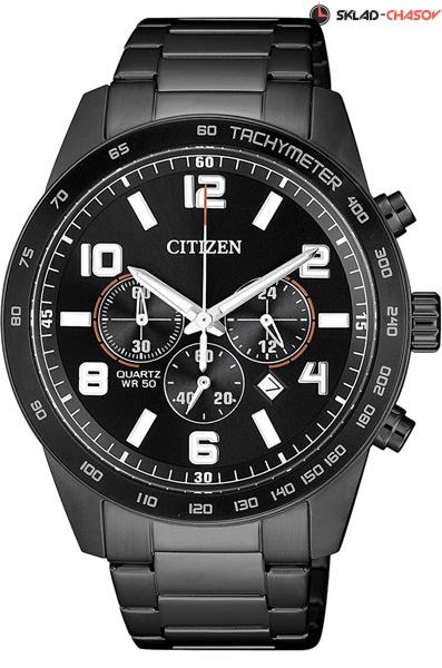 Мужские кварцевые наручные часы с хронографом (секундомером) Citizen AN8165-59E. Калибр механизма — 0520. На данной модели отображается дата и время суток (24-х часовая шкала). Секундомер может отсчитывать до 59 минут 59 сек. Стрелки и метки покрыты люминесцентным напылением (светятся в темноте). На корпус и браслет нанесено стойкое PVD покрытие.