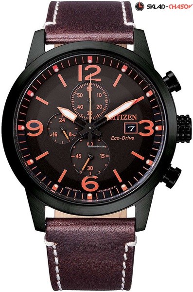Мужские кварцевые часы с хронографом (секундомером) Citizen CA0745-11E коллекции Eco-Drive Chrono. Калибр механизма — B612. Аккумулятор данной модели заряжается от любого источника света. Срок работы аккумулятора с полным зарядом — 210 дней. Примерный срок службы аккумулятора — 10 лет. Присутствует функция информирования о недостаточном заряде. На данной модели отображается дата и время суток (24-х часовая шкала). Секундомер может отсчитывать до 59 минут 59 сек. с точностью 1/5 секунды. Ремешок — телячья кожа. На корпус нанесено стойкое PVD покрытие. Стрелки и метки покрыты люминесцентным напылением (светятся в темноте). Завинчивающаяся задняя крышка часов. Водонепроницаемость WR100 (10 атм).