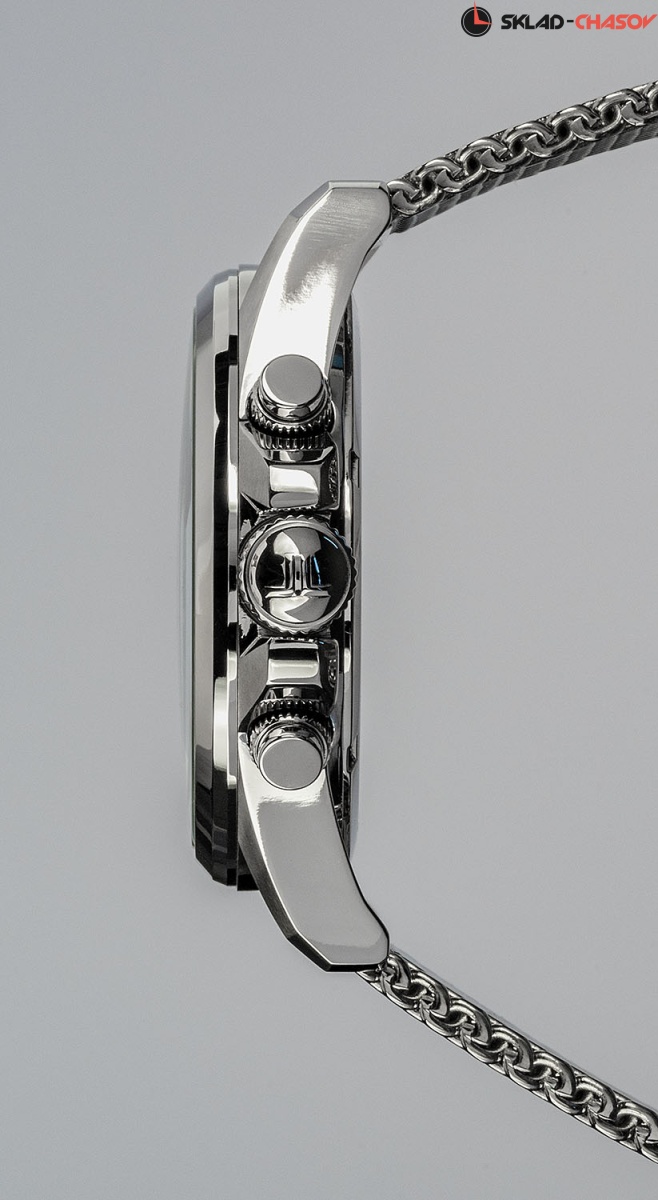 Кварцевый хронограф. Механизм Miyota калибр FS20. Смещенная секундная стрелка (положение 6 часов). Окошко даты. Суточный индикатор (1-24 часа) в положении 3 часа. Центральная стрелка хронографа и минутный накопитель в положении 9 часов. Доступный режим измерения ADD. Максимальное время измерения 59 минут 59 секунд. • Точность хода не хуже -/+ 20 сек./в месяц. • Элемент питания SR626SW. Срок службы батареи 24 месяца. • Выпуклое минеральное стекло устойчивое к возникновению царапин. • Светонакопительный состав на стрелках и маркерах часа. • Корпус из высококачественного стального сплава 316L с высокими антикоррозийными свойствами со стойким PVD покрытием. • Водозащита до 20 АТМ. • Сетчатый миланский браслет, который обладает подвижностью, позволяет коже руки дышать даже в самую жаркую погоду. Основные достоинства плетеных браслетов – отсутствие острых краев, гибкость и прочность. Мелкие звенья металла гладкие и не доставляют неприятных ощущений.