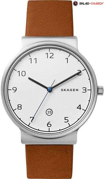 Гарантия 2 года. Функции: Число. Комплектация: Часы, фирменная упаковка, инструкция на русском языке, заполненная международная гарантия Бренд Skagen Страна Дания Коллекция Ancher Пол Мужские Вид механизма Кварцевые часы Тип браслета/ремешка Кожаный Корпус Нержавеющая сталь Стекло Минеральное Водозащита WR 30 Цвет корпуса Серебряный Цвет циферблата Белый Цвет ремешка Коричневый Форма корпуcа Круглые Отображение времени Аналоговое Цифры Арабские Диаметр 40 мм. Толщина 7 мм. Артикул SKW6433