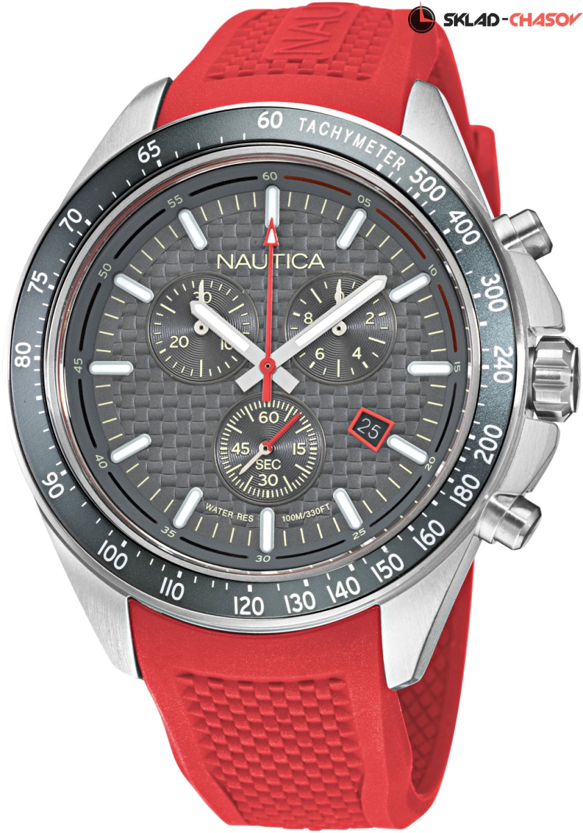 Мужские часы-хронограф в крепком корпусе из нержавеющей стали станут идеальным спутником на тренировках. Ocean Beach. Часы-хронограф с секундомером и тахиметром. Циферблат и силиконовый ремешок украшены декоративным узором. Метки в виде штрихов. Окошко даты находится в положении 4 часа. Рифленая заводная головка с защитой и завинчивающаяся задняя крышка украшены выгравированными фирменными логотипами Nautica в виде стилизованного паруса.