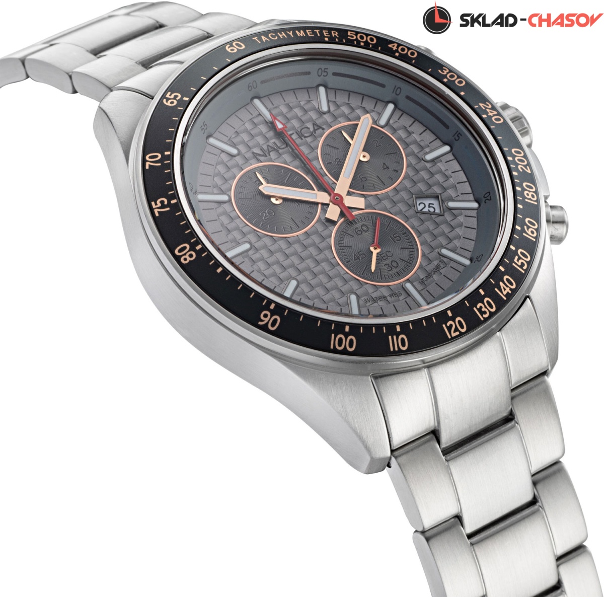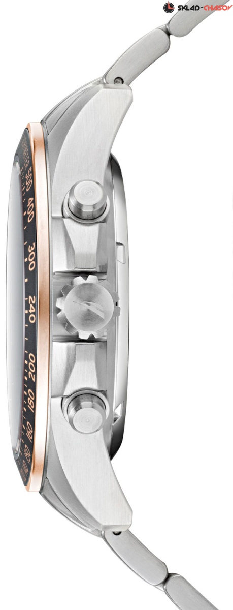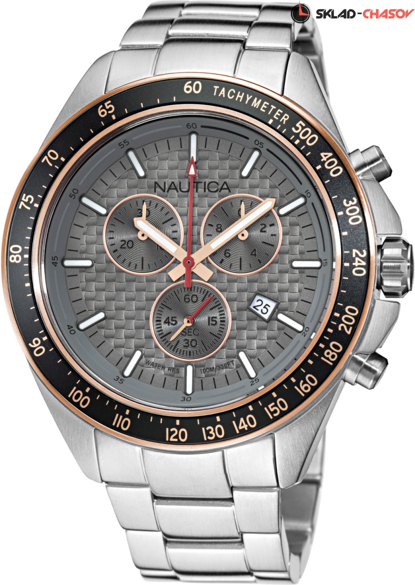 Мужские часы-хронограф в крепком корпусе из нержавеющей стали станут идеальным спутником на тренировках. Ocean Beach. Часы-хронограф с секундомером и тахиметром. Циферблат украшен декоративным узором. Метки в виде штрихов. Окошко даты находится в положении 4 часа. Рифленая заводная головка с защитой и завинчивающаяся задняя крышка украшены выгравированными фирменными логотипами Nautica в виде стилизованного паруса. Стальной браслет с раскладывающейся застежкой.