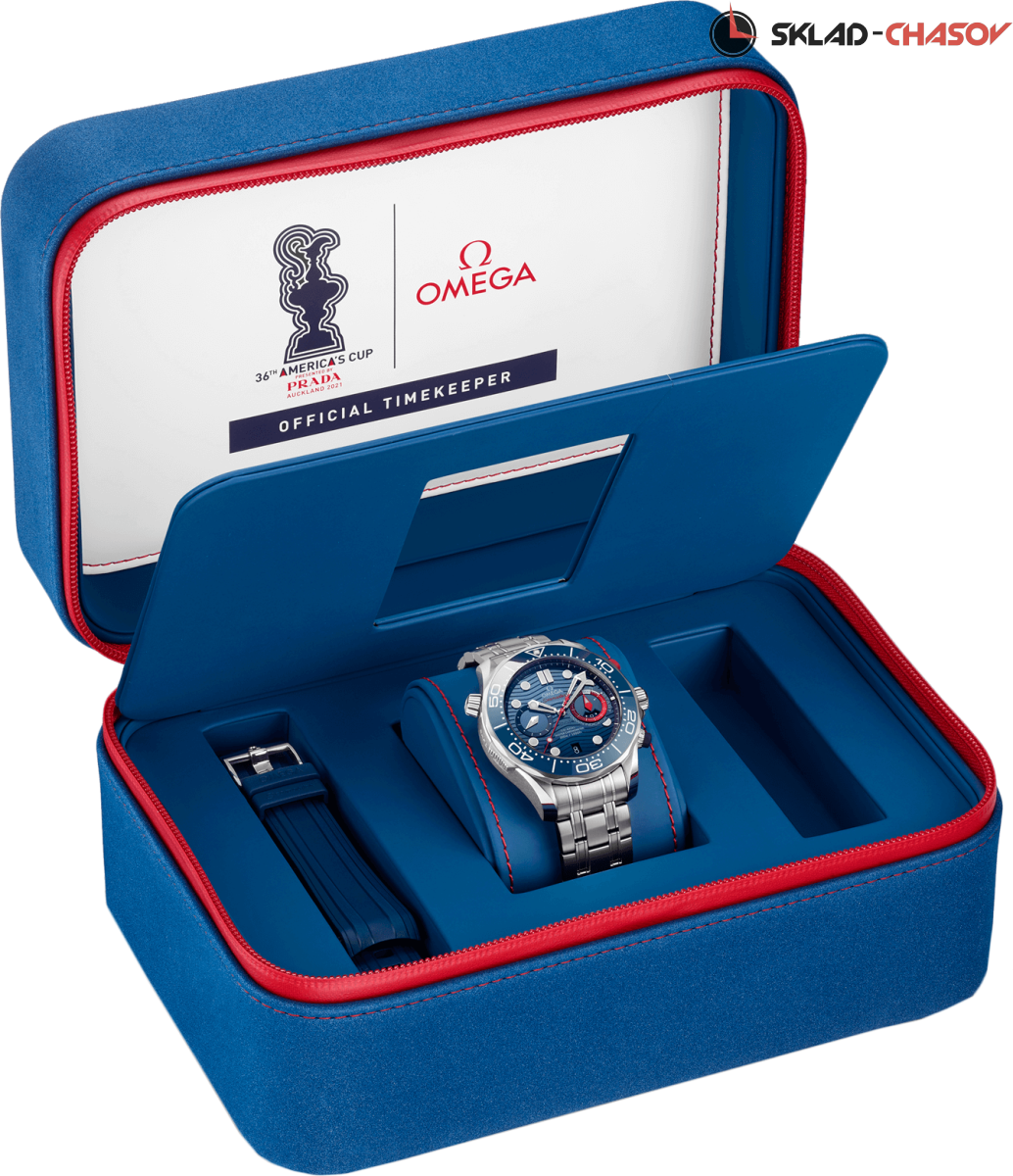 Модель посвящена роли OMEGA в качестве официального хронометриста на 36-м Кубке Америки, воплощает собой морскую стихию, дух парусного спорта и инновационные технологии. На задней крышке с узором в виде сот нанесены гравировки с синим лаком "36th America’s Cup" и "Auckland 2021". Часы предлагаются в специальном подарочном футляре в цветах Кубка Америки.