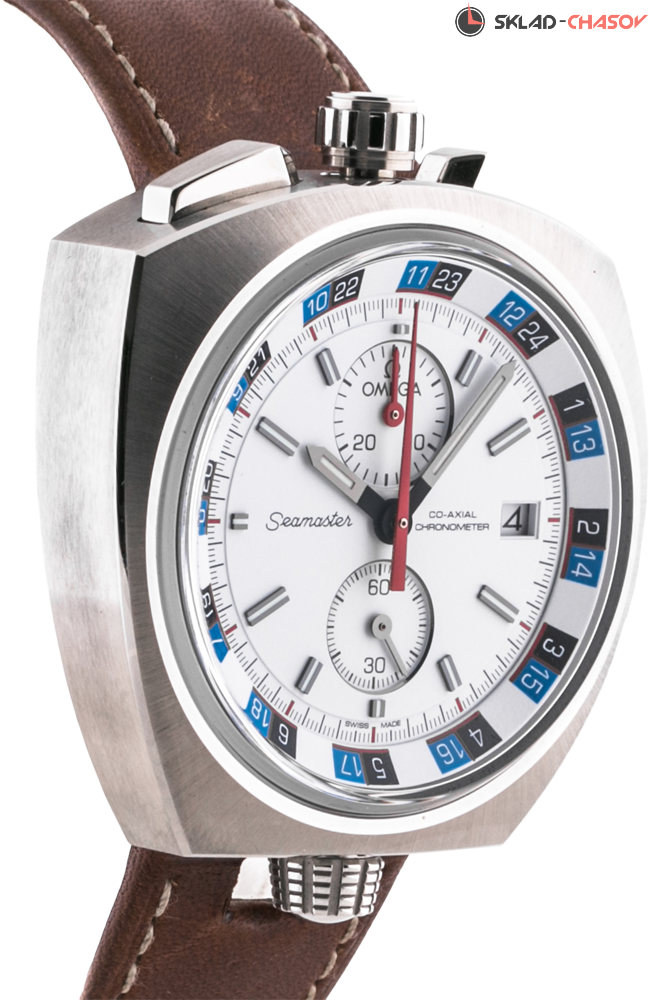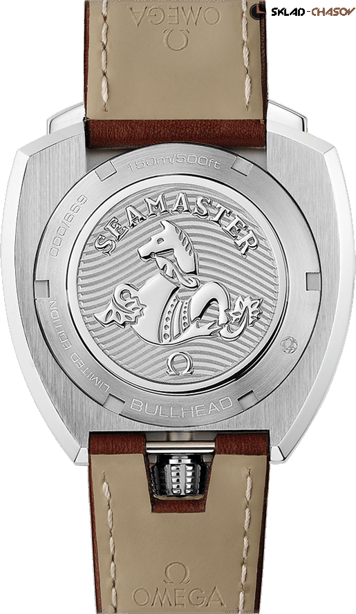 Хронометр C.O.S.C., хронограф, индикация даты, завинчивающаяся заводная головка, вращающийся в обоих направлениях внутрений безель, вынесенная секундная стрелка в положении 6 часов, 24-х часовая шкала. Чтобы удовлетворить давнюю мечту почитателей Seamaster Bullhead, OMEGA перевыпустила ограниченную серию этого легендарного хронографа. Limited Edition 669 экз.