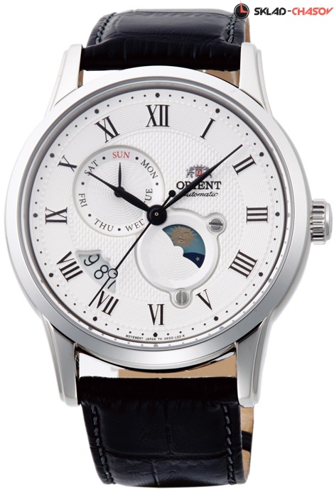 Мужские механические наручные часы с автоподзаводом и возможностью ручного завода Orient RA-AK0008S (RA-AK0008S10B) коллекции Sun & Moon Classic. Калибр механизма — F6B24. Запас хода более 40-ка часов. Количество камней - 22. Функция стоп-секунда (остановка секундной стрелки для установки точного времени). На данной модели отображается дата, день недели и время суток (день/ночь). Установлено сапфировое стекло устойчивое к царапинам. Прозрачная завинчивающаяся задняя крышка. Кожаный ремешок. Водонепроницаемость WR50 (5 атм).