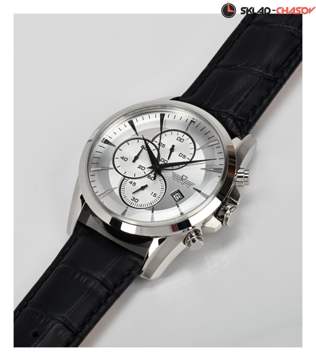 Центральная секундная стрелка часов не относится к механизму хронометража, как у многих хронографов - многим это нравится, так как не создаётся впечатление, что часы стоят, как в случае, когда центральная секундная стрелка запускается кнопками хронографа. У отметки "6" часов - секундный накопитель хронографа, у отметки "12" часов - 1/10 секунд, а левый накопитель у отметки "9" часов считывает минуты хронографа. "Окно" даты расположено у отметки "5" часов.