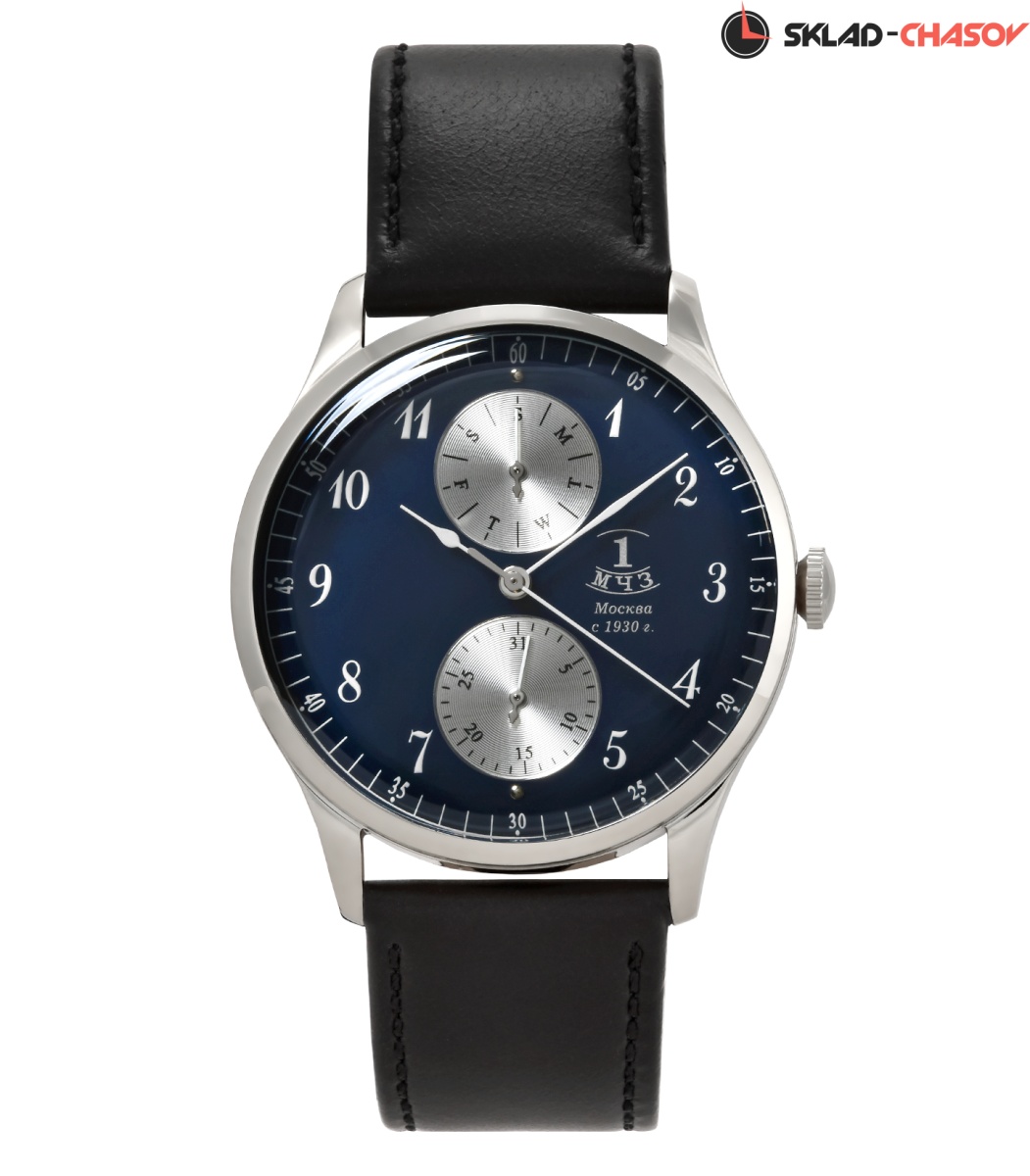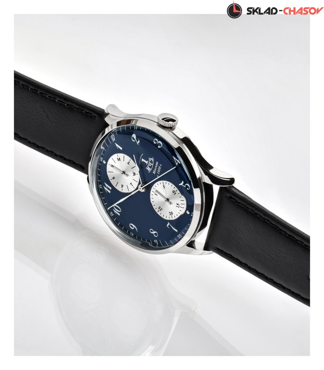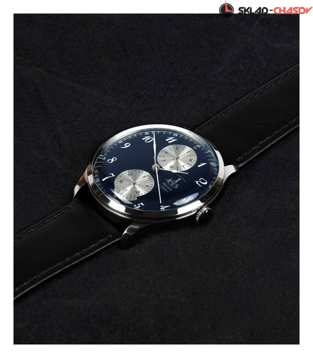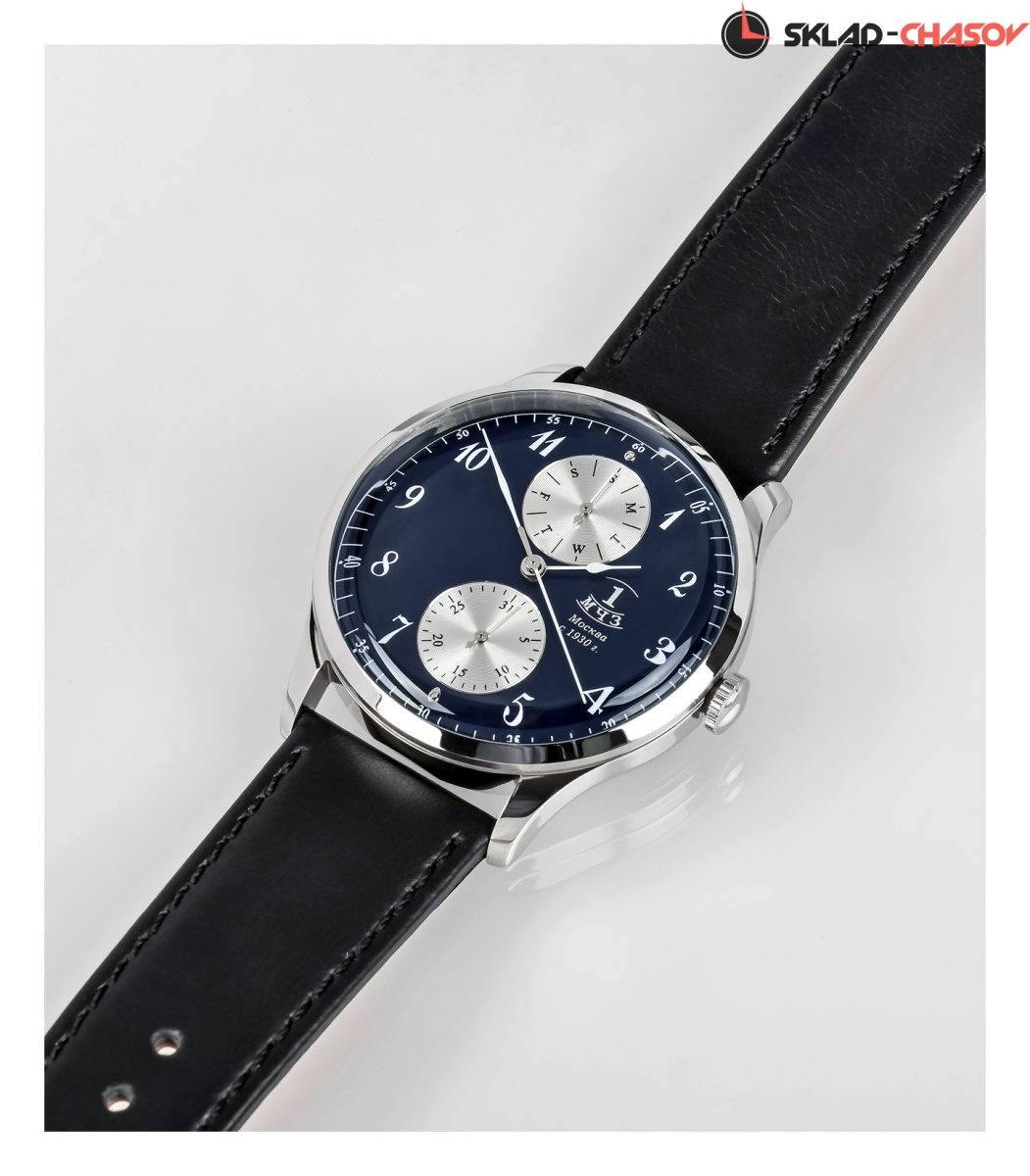 Классические кварцевые наручные часы в стиле начала прошлого века. Тонкие элегантные стрелки показывают часы, минуты и секунды, а на дополнительных циферблатах, расположенных у отметки "6" и "12", стрелочная индикация день недели.