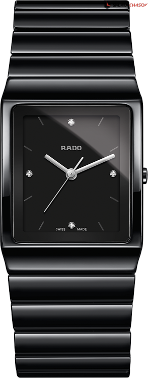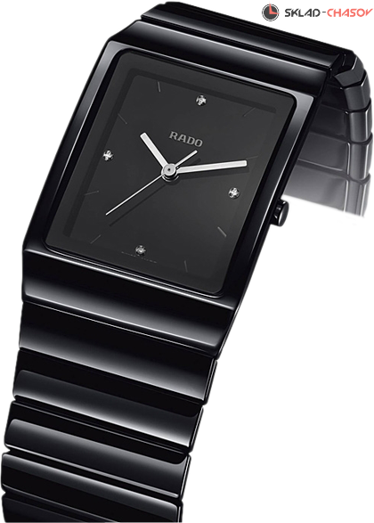 Монолитный керамический корпус, окошко даты в положении 6 часов, циферблат украшен 4 бриллиантами общим весом 0.026 ct