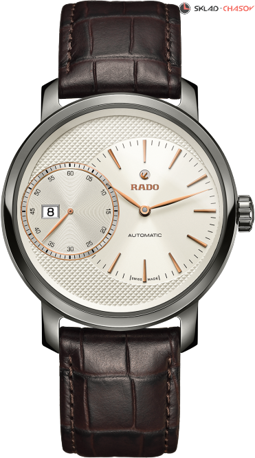 Мужская модель, часовая и минутные стрелки смещены в положение 3 часов, вынесенная секундная стрелка в положении 9 часов, окошко даты в положении 9 часов