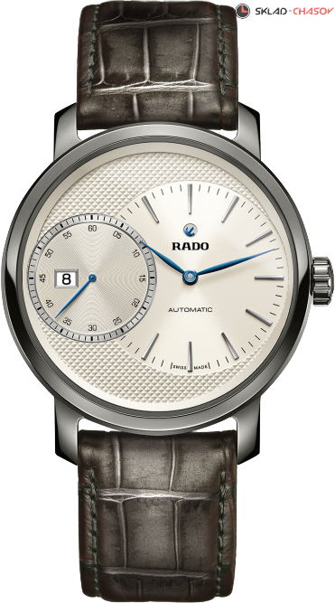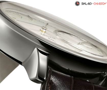Мужская модель, часовая и минутные стрелки смещены в положение 3 часов, вынесенная секундная стрелка в положении 9 часов, окошко даты в положении 9 часов