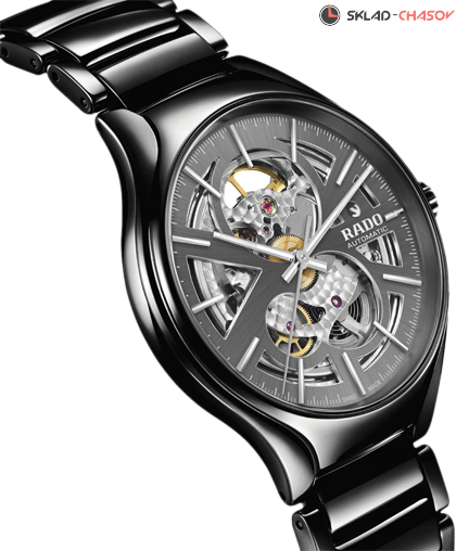 Мужская модель, индикация часов, минут и секунд центральными стрелками, скелетонированный циферблат.