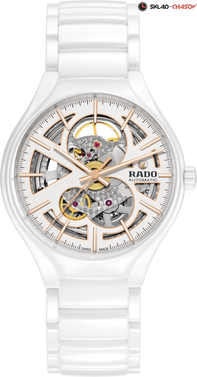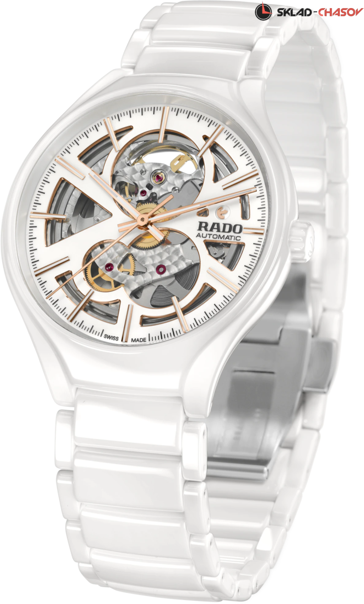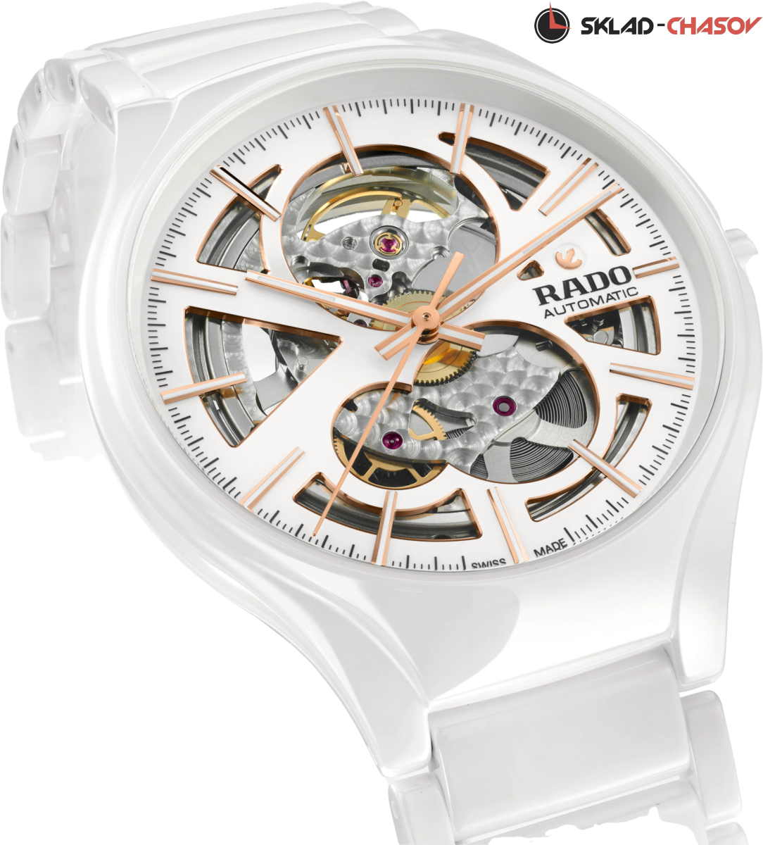 Мужская модель в белом исполнении, индикация часов, минут и секунд центральными стрелками, скелетонированный циферблат.