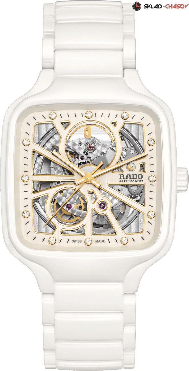 Модель True Square — это новый взгляд на знаменитую форму часов Rado. Первые часы в корпусе моноблок квадратной формы из высокотехнологичной керамики. Скелетонированный циферблат. Прозрачная задняя крышка из сапфирового стекла. Циферблат украшен 12 бриллиантами общим весом 0.096 ct
