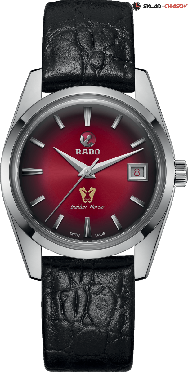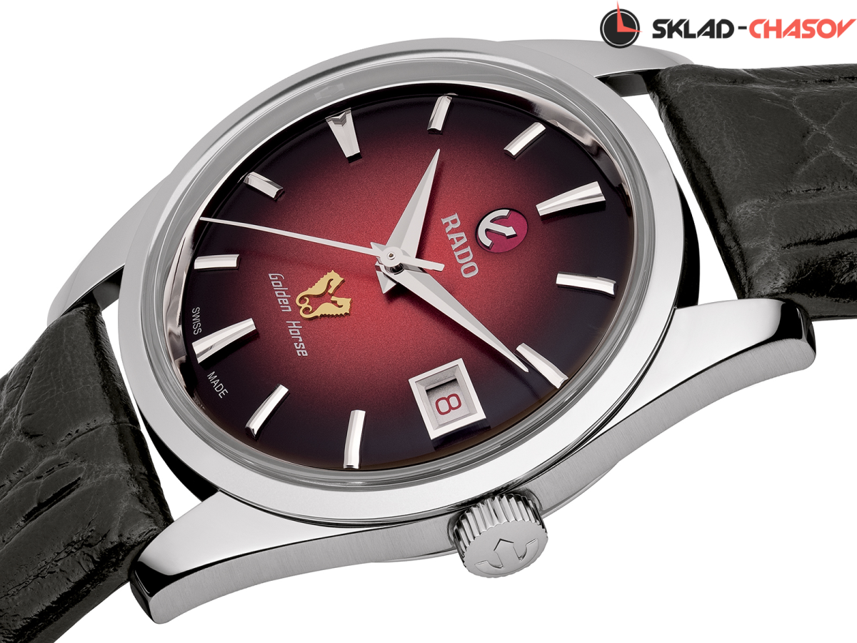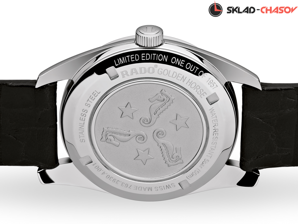 Модель Golden Horse Limited Edition, как и оргинальная модель 1957 года, выполнена в корпусе диаметром 37 мм, с изогнутым циферблатом и фирменным символом движущегося якоря. Этот символ бессменно является свидетельством швейцарского автоматического механизма Rado.