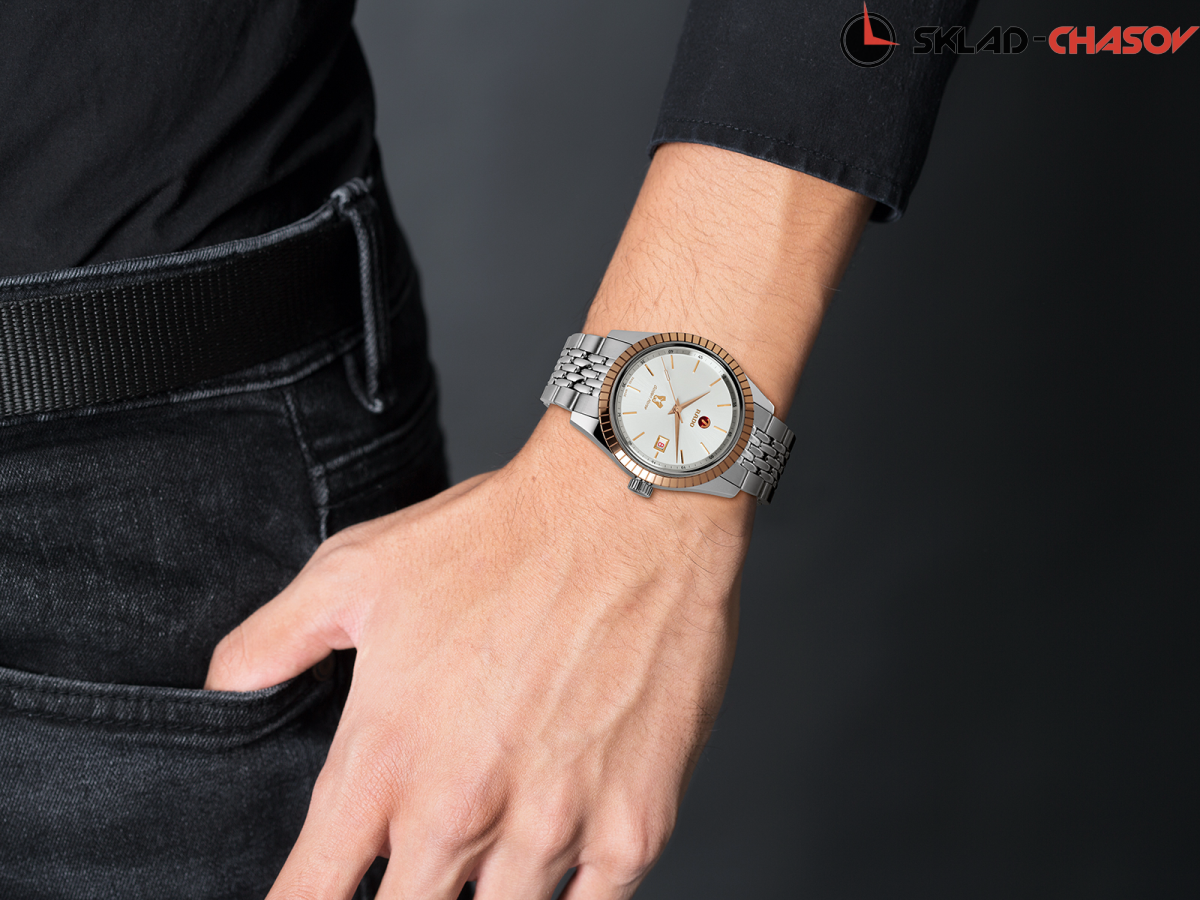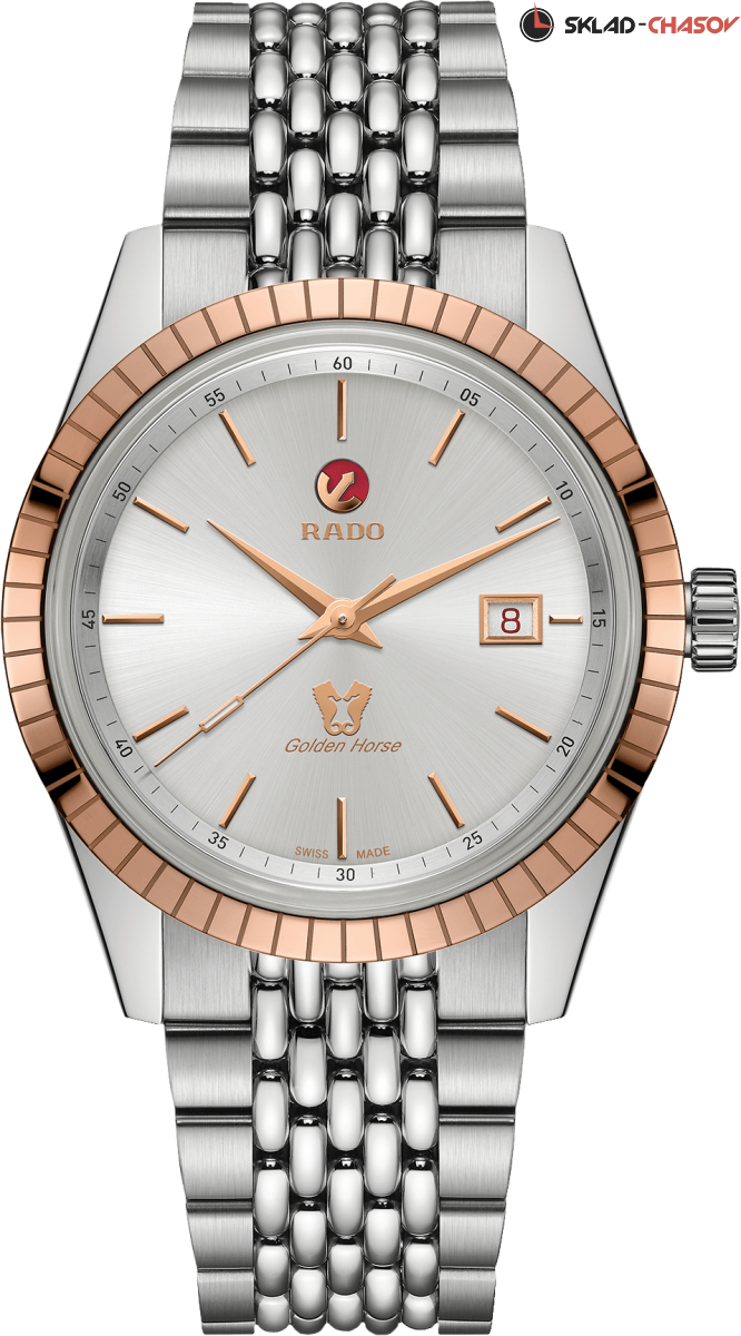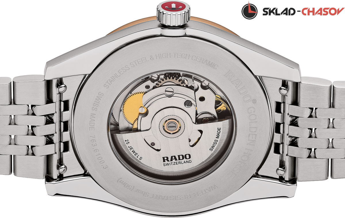 Современная модель, выполненная по оригинальному дизайну Rado 1957 года. Часы дополнены безелем из высокотехнологичного материала Ceramos цвета розового золота. Окошко даты на отметке 3 часа. Прозрачная задняя крышка.