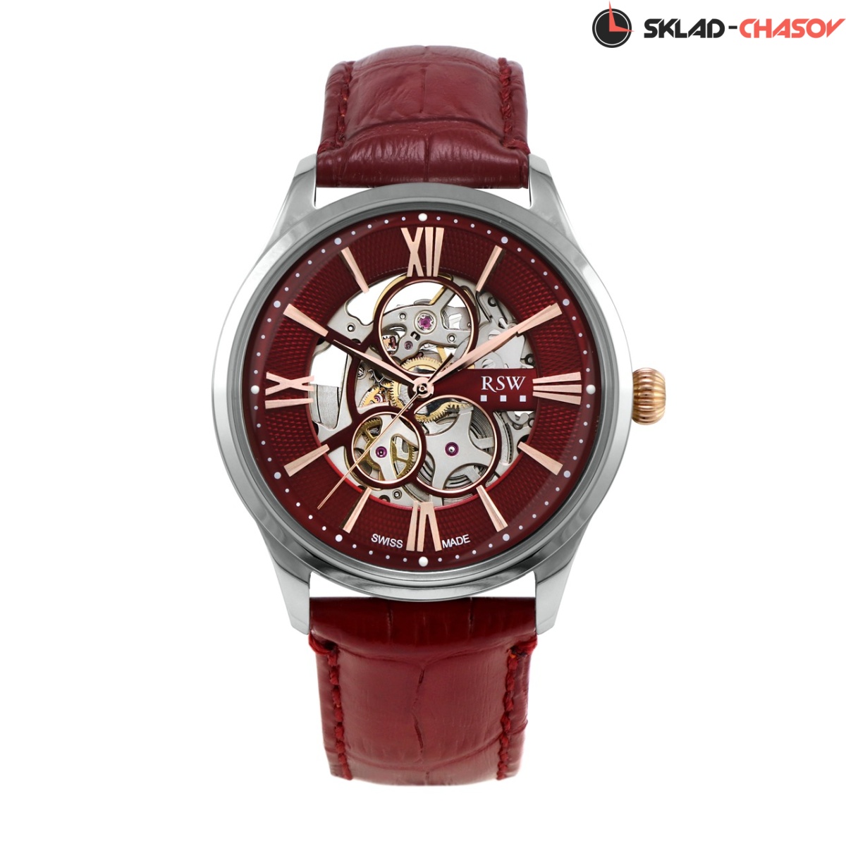 Автоматические Мужские часы RSW, коллекция Automatic Sceleton (RSWA155-SRL-5), производство ШВЕЙЦАРИЯ, диаметр - 42 мм, материал корпуса - Сталь, Ремень, материал браслета - Кожа, циферблат - Коричневый, Римские цифры и Метки