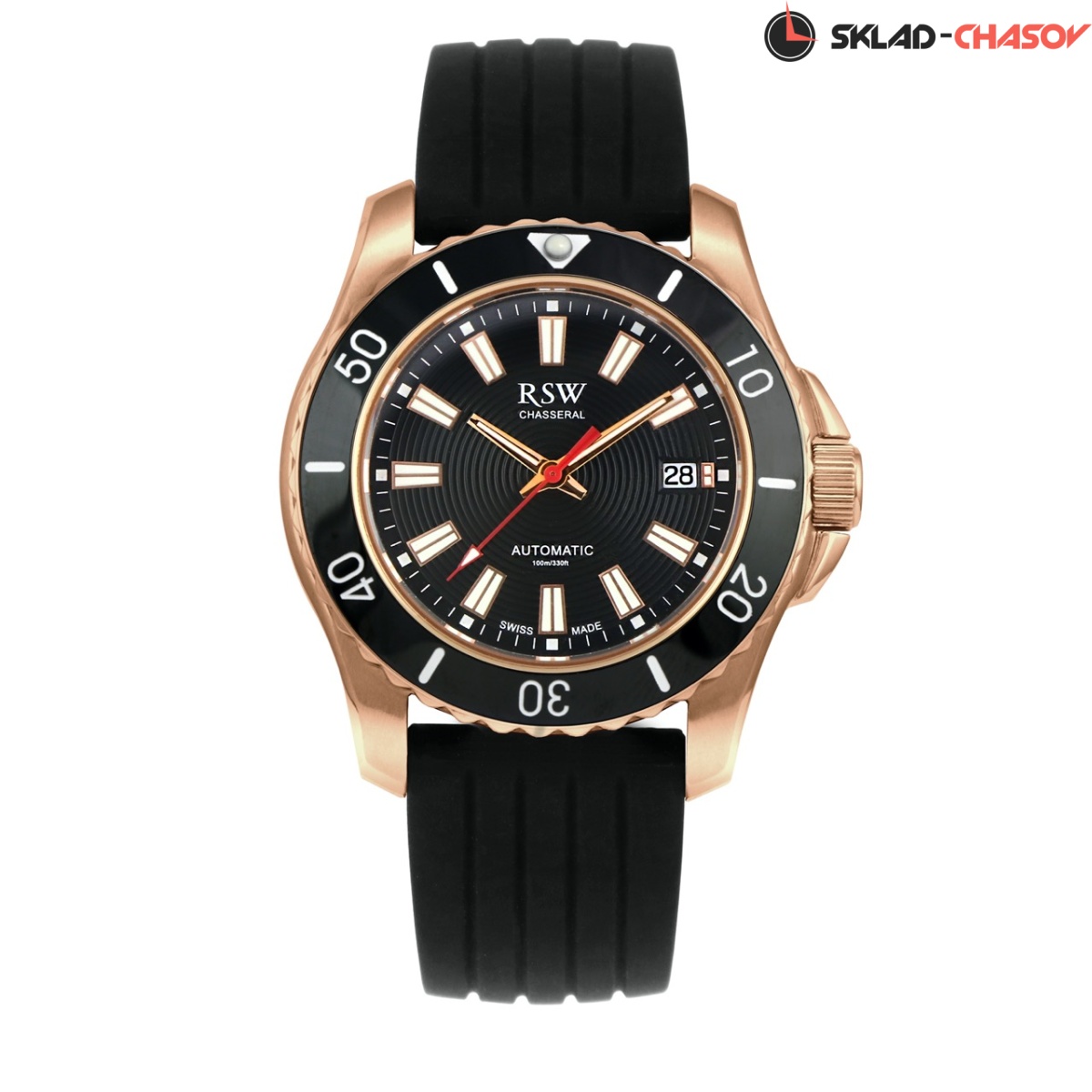 Автоматические Мужские часы RSW, коллекция Hunter (RSWA133-BRX-3), производство ШВЕЙЦАРИЯ, диаметр - 40 мм, материал корпуса - Розовый PVD, Ремень, материал браслета - Каучук, циферблат - Черный, Метки, Дата