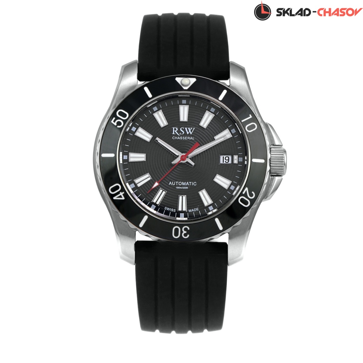 Автоматические Мужские часы RSW, коллекция Hunter (RSWA133-SRX-3), производство ШВЕЙЦАРИЯ, диаметр - 40 мм, материал корпуса - Сталь, Ремень, материал браслета - Каучук, циферблат - Черный, Метки, Дата