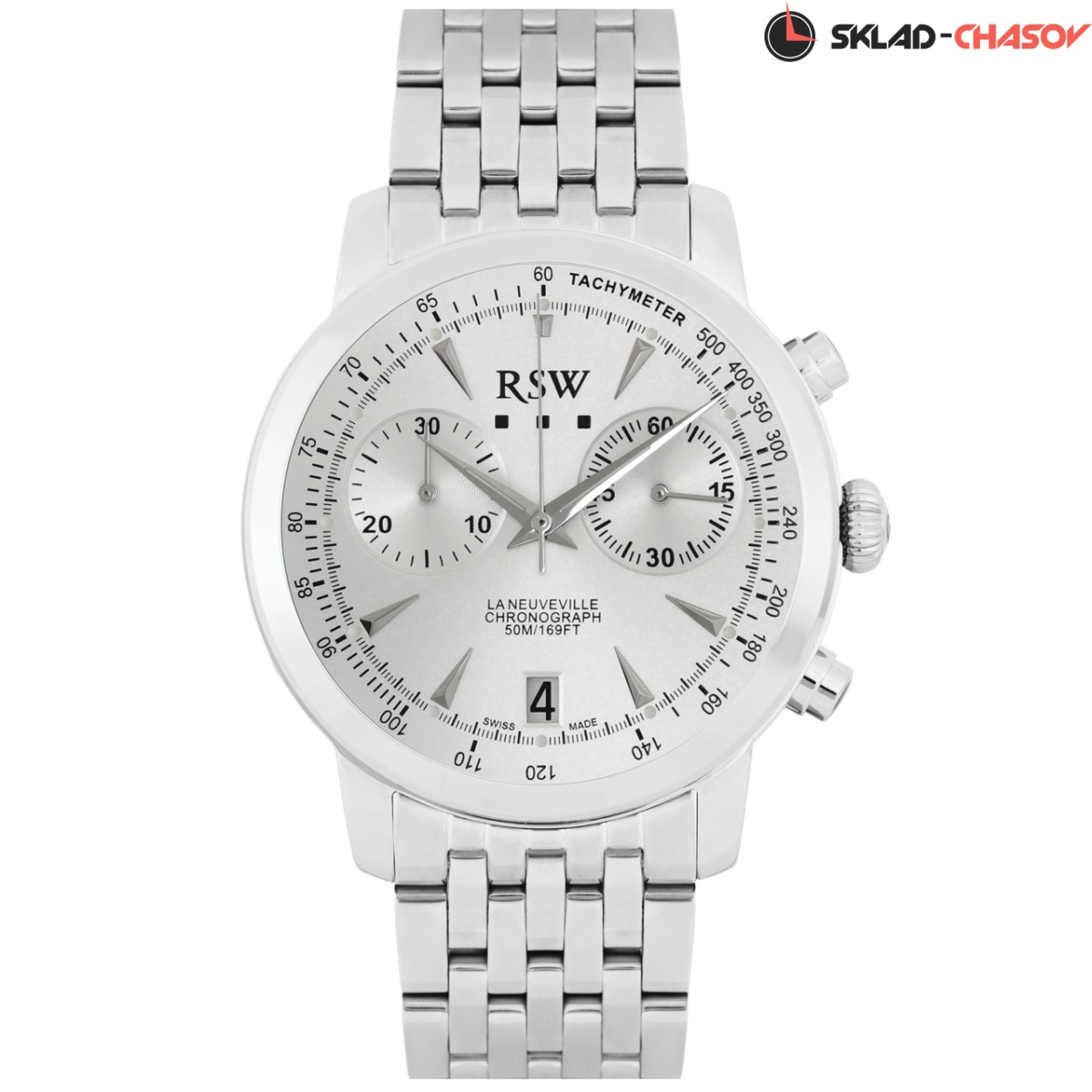 Кварцевые Мужские часы RSW, коллекция La Neuveville (RSWC127-SS-1), производство ШВЕЙЦАРИЯ, диаметр - 44 мм, материал корпуса - Сталь, Браслет, материал браслета - Сталь, циферблат - Серебристый, Метки, Дата, Хронограф