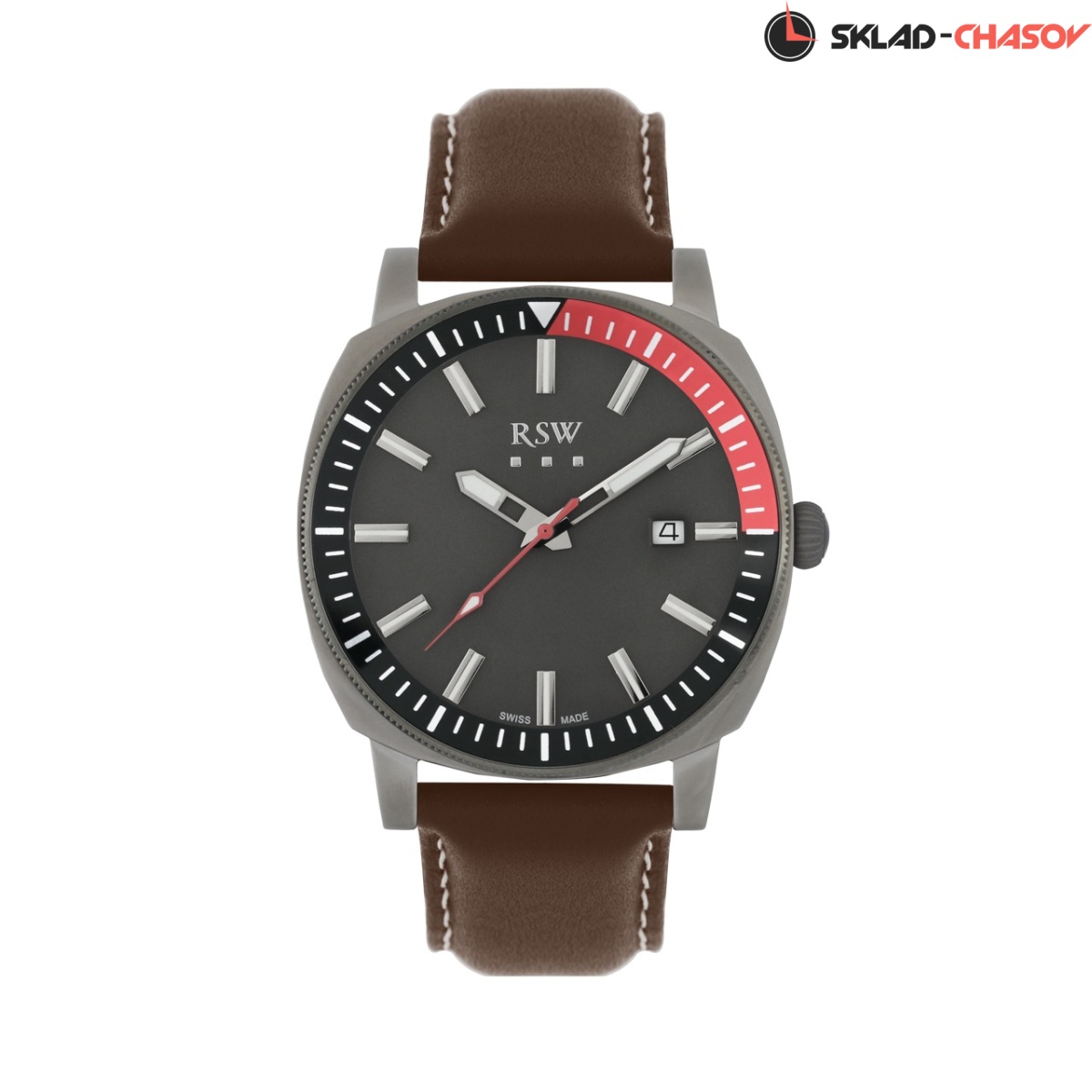 Кварцевые Мужские часы RSW, коллекция Romeo (RSWM117-TL-2), производство ШВЕЙЦАРИЯ, диаметр - 44 мм, материал корпуса - Матовая оружейная сталь, Ремень, материал браслета - Кожа, циферблат - Серый, Метки, Дата