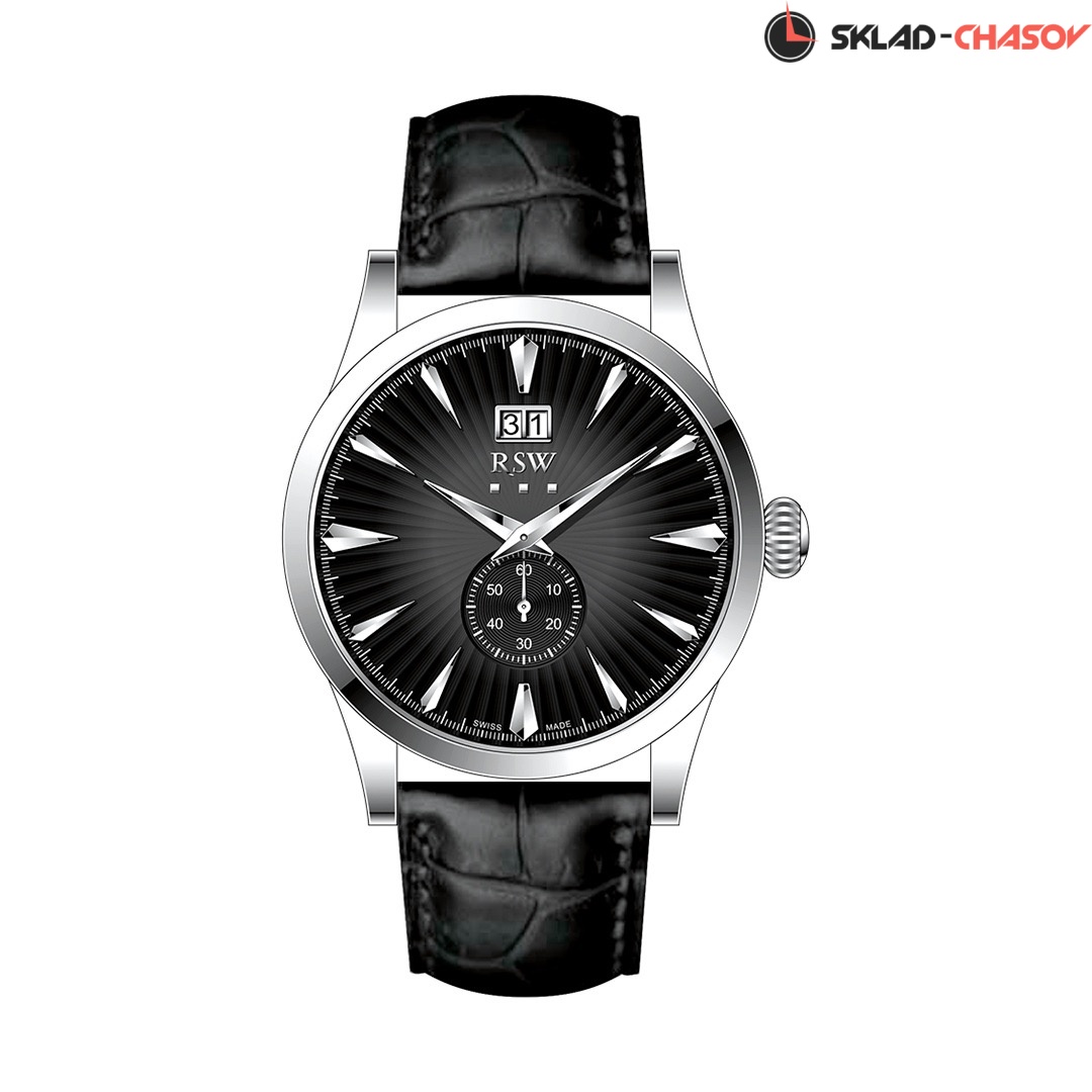 Кварцевые Мужские часы RSW (RSWM111-SL-3), производство ШВЕЙЦАРИЯ, диаметр - 42 мм, материал корпуса - Сталь, Ремень, материал браслета - Кожа, циферблат - Черный, Метки, Большая дата