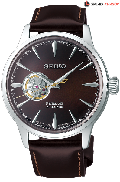 Мужские механические наручные часы с автоподзаводом и возможностью ручного завода Seiko SSA407J1 Stinger коллекции Presage Cocktail Time. Дизайн серии Cocktail Time разработан совместно с известным Японским барменом Шинобу Ишигаки, цвет циферблата данной модели соответствует цвету одного из его коктейлей. Калибр механизма — 4R38. Запас хода более 40-ка часов. 21 600 полуколебаний в час. Количество камней - 24. Функция стоп-секунда (остановка секундной стрелки для установки точного времени). На циферблате расположено прозрачное окошко, через него частично видно работу механизма. Установлено сферическое минеральное стекло повышенной прочности Hardlex Crystal. Ремешок — телячья кожа. Удобная застежка автоматическая клипса. Завинчивающаяся задняя крышка часов. Водонепроницаемость WR50 (5 атм). Японская сборка (Made In Japan).