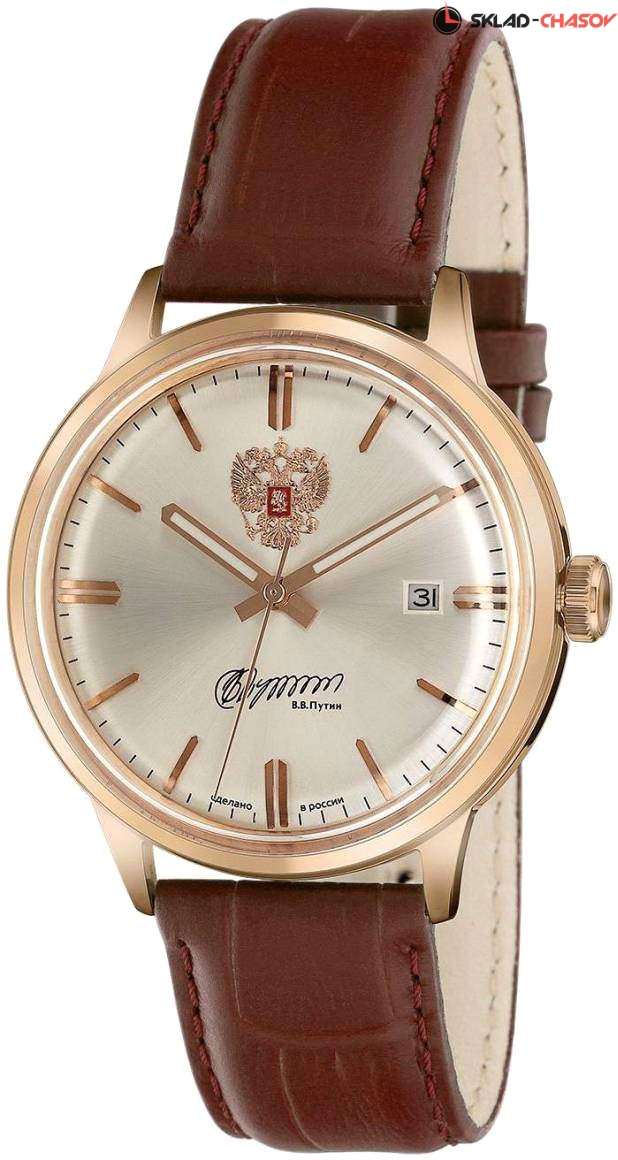 Часы на ремешке станут отличным вариантом на каждый день. Ваш безупречный стиль! Премьер. Элегантные мужские наручные часы на каждый день. В механизме 21 камень, частота 21600 полуколебаний в час. Запас хода 42 часа. Круглый стальной корпус с минеральным стеклом. На циферблате изображение герба Российской Федерации и автографа В.В. Путина. Циферблат выполнен по технологии Sunray (солнечные лучи). Заостренные прямоугольные стрелки в стиле Baton с люминесцентным покрытием, которое светится в темноте после непродолжительной зарядки на свету. Метки в виде штрихов. Окошко даты находится в положении 3 часа. Рифленая заводная головка.