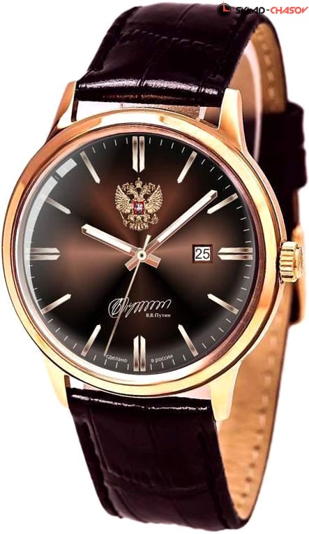 Часы на ремешке станут отличным вариантом на каждый день. Ваш безупречный стиль! Премьер. Элегантные мужские часы. В механизме 21 камень, частота 21600 полуколебаний в час. Запас хода 42 часа. Круглый стальной корпус с минеральным стеклом. На циферблате изображение герба Российской Федерации и автографа В.В. Путина. Циферблат выполнен по технологии Sunray (солнечные лучи). Заостренные прямоугольные стрелки в стиле Baton с люминесцентным покрытием, которое светится в темноте после непродолжительной зарядки на свету. Метки в виде штрихов. Окошко даты находится в положении 3 часа. Рифленая заводная головка. Текстурированный кожаный ремешок с классической застежкой.