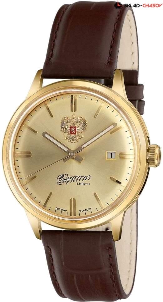 Часы на ремешке станут отличным вариантом на каждый день. Ваш безупречный стиль! Премьер. Элегантные часы. В механизме 21 камень, частота 21600 полуколебаний в час. Запас хода 42 часа. Круглый стальной корпус с минеральным стеклом. На циферблате изображение герба Российской Федерации и автографа В.В. Путина. Циферблат выполнен по технологии Sunray (солнечные лучи). Заостренные прямоугольные стрелки в стиле Baton с люминесцентным покрытием, которое светится в темноте после непродолжительной зарядки на свету. Метки в виде штрихов. Окошко даты находится в положении 3 часа. Рифленая заводная головка. Завинчивающаяся задняя крышка. Текстурированный кожаный ремешок с классической застежкой.