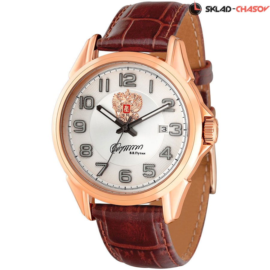 Механические часы с автоподзаводом. Водостойкость WR 50. Центральные часовая, минутная и секундная стрелки. Индикация даты. Серебристый циферблат с часовыми индексами в виде цифр. Корпус выполнен из нержавеющей стали с IP покрытием. Диаметр корпуса 42 мм, толщина 12 мм. Устойчивое к возникновению мелких механических повреждений минеральное стекло. Кожаный ремешок коричневого цвета.
