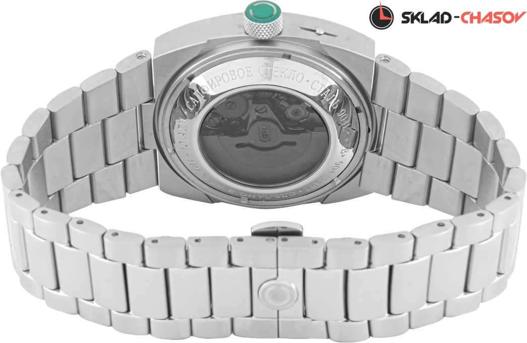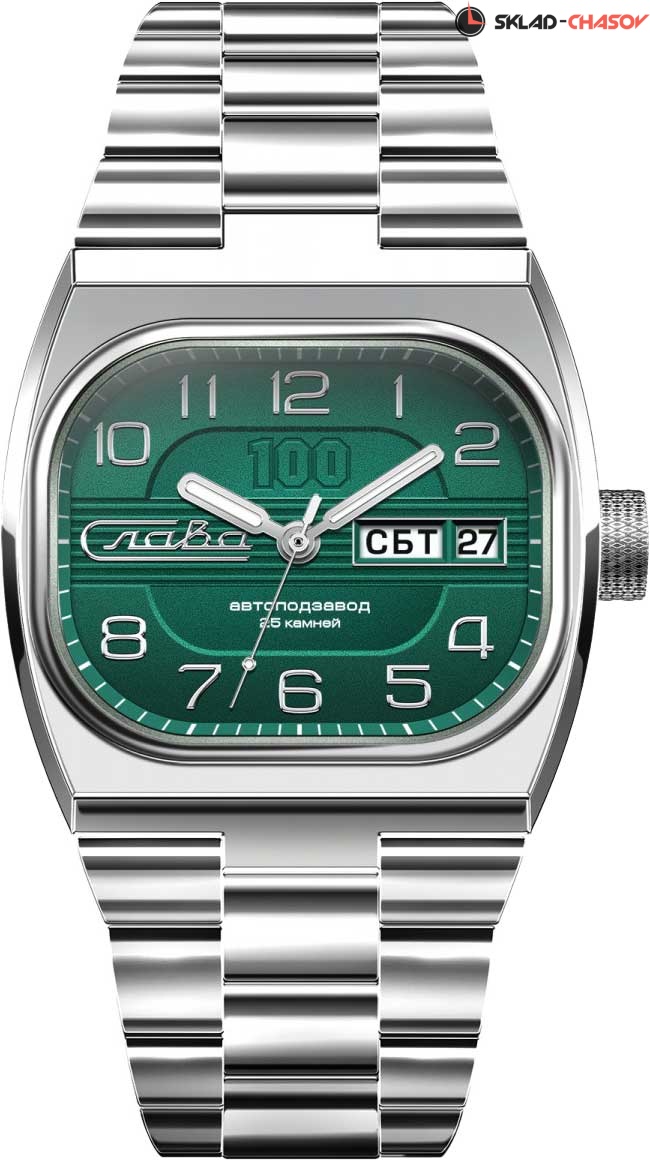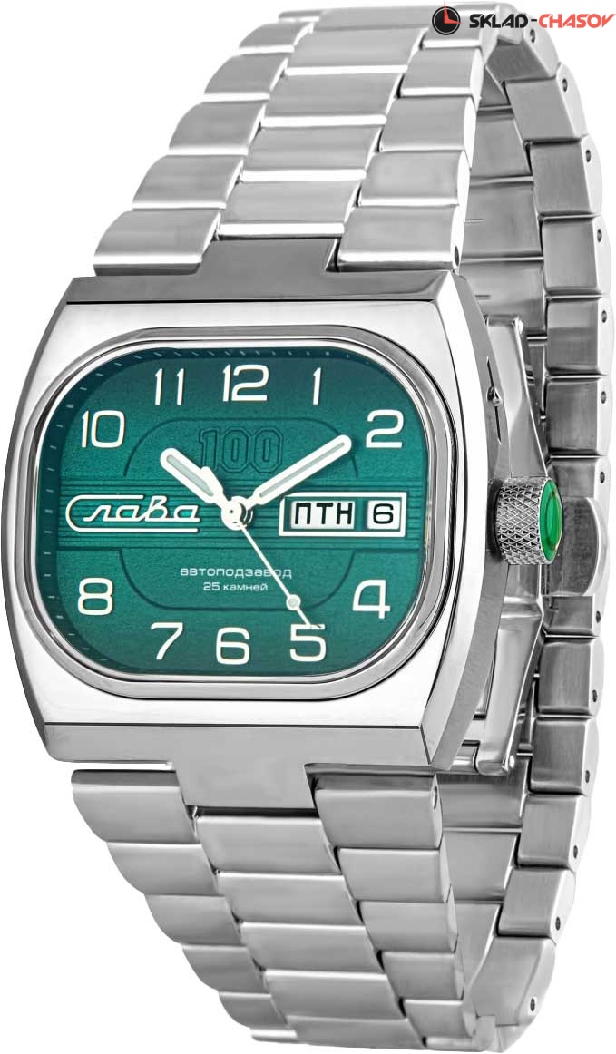 Лимитированная серия - 500 экземпляров. Мужские автоматические наручные часы Телевизор. Компания «Слава» выпустила новый вариант часов, который был очень популярен в СССР и получил название «Танк». В механизме 25 камней, частота 18000 полуколебаний в час. Запас хода 31 час. Прямоугольный матовый стальной корпус. Сатинированный циферблат украшен цифрой «100». Окошко даты и дня недели. Прозрачная задняя крышка. Заводная головка с алмазной гранью, украшена эмалью и фирменной буквой «С». Надежный матовый стальной браслет с раскладывающейся застежкой.