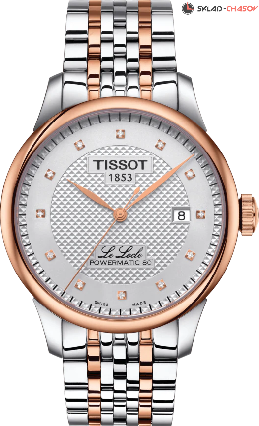 Популярная модель дополнена механизмом с запасом хода 80 часов. Индикация даты в положении 3 часа. Циферблат украшен 12 бриллиантами вместо разметки.