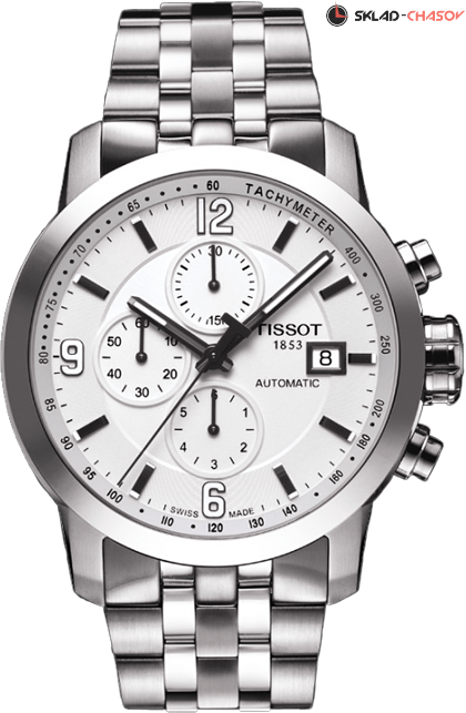 Мужской механический хронограф, индикация часов и минут центральными стрелками, малая секундная стрелка в положении 9 часов, окошко даты в положении 3 часа