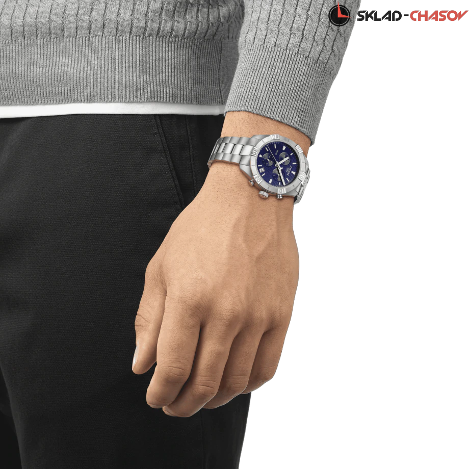 Мужской спортивный кварцевый хронограф, малая секундная стрелка в положении 6 часов, 30-минутный счетчик на 10 часов и счетчик 1\10 секунды на 2 часа. Апертура даты расположена между 4 и 5 часами.