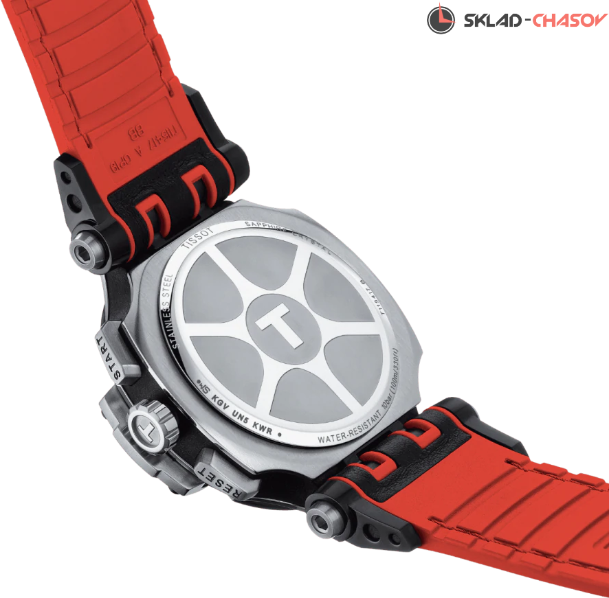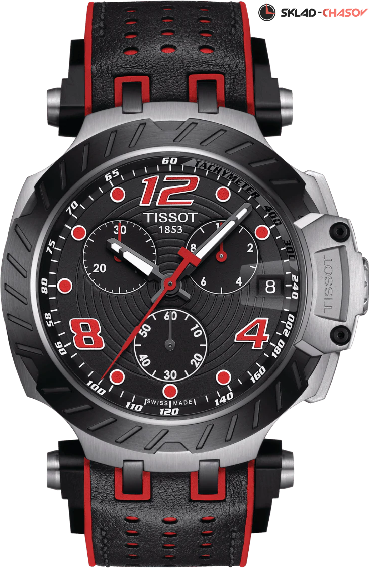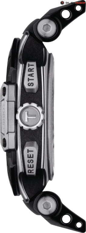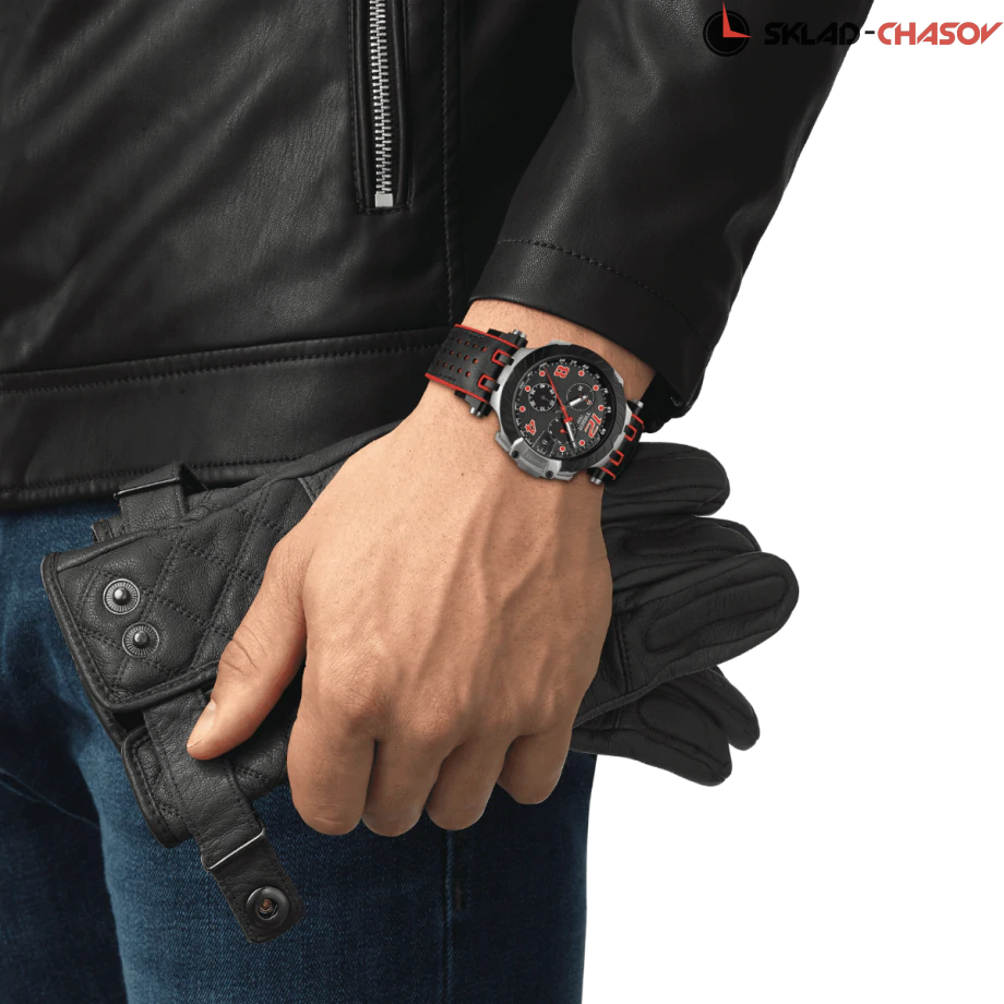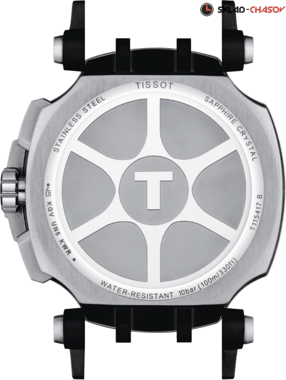 Мужской спортивный кварцевый хронограф, малая секундная стрелка в положении 6 часов, 30-минутный счетчик на 10 часов и счетчик 1\10 секунды на 2 часа. Апертура даты расположена в районе 3 часов.