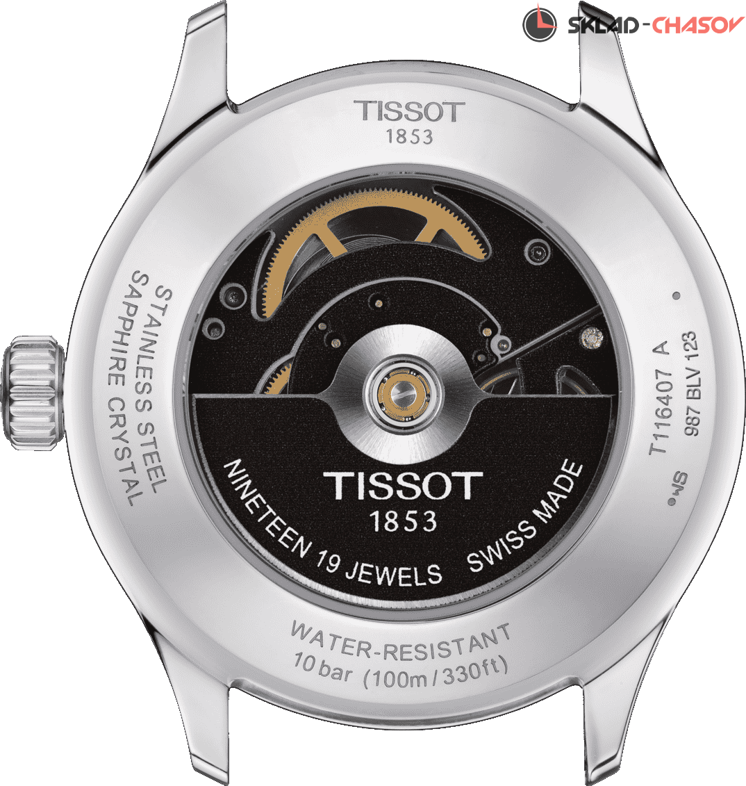 Мужская модель с индикацией минут, часов и секунд центральными стрелками. Индикация даты в положении 3 часов, прозрачная задняя крышка.