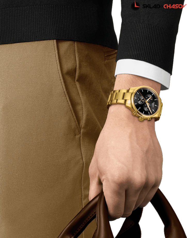 Мужской кварцевый хронограф. Окошко даты в положении 4 часа, малая секунда в положении 6 часов, 30-минутный счетчик на 10 часов и счетчик 1\10 секунды на 2 часа.