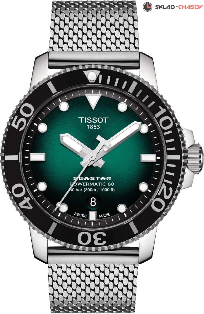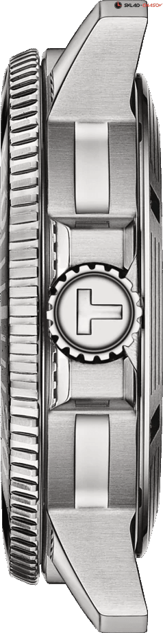 Мужская модель для поклонников водных видов спорта. Однонаправленно вращающийся безель с минутной шкалой, окошко даты в положении 6 часов, люминесцентное покрытие на разметке и стрелках, браслет миланского плетения.