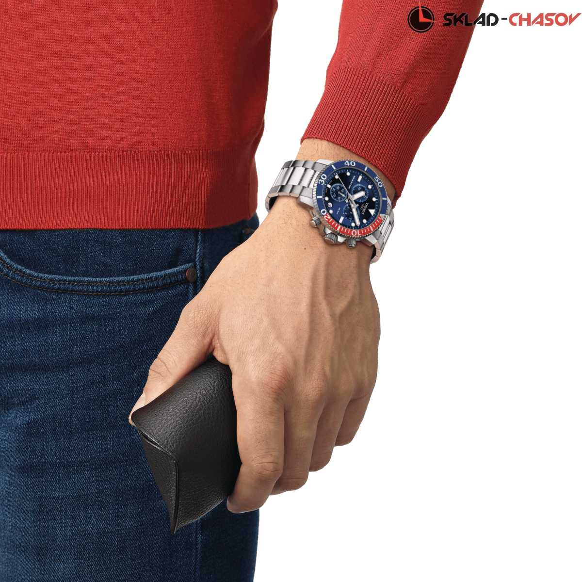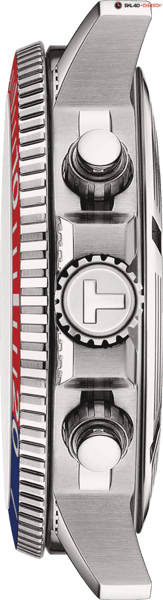 Мужской спортивный хронограф, индикация часов и минут центральными стрелками, малая секундная стрелка в положении 6 часов, окошко даты в положении 4 часа, однонаправленно вращающийся безель, завинчивающаяся заводная коронка